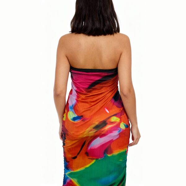 A strapless midi dress designed to make a statement. Featuring a bold abstract print with fluid color transitions, this dress hugs the body with a sleek, streamlined silhouette. The strapless neckline keeps the look modern and effortless, making it ideal for evenings, parties, or styled occasions.