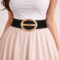 Elegant black elastic waist belt with bold oval gold buckle for a chic look.