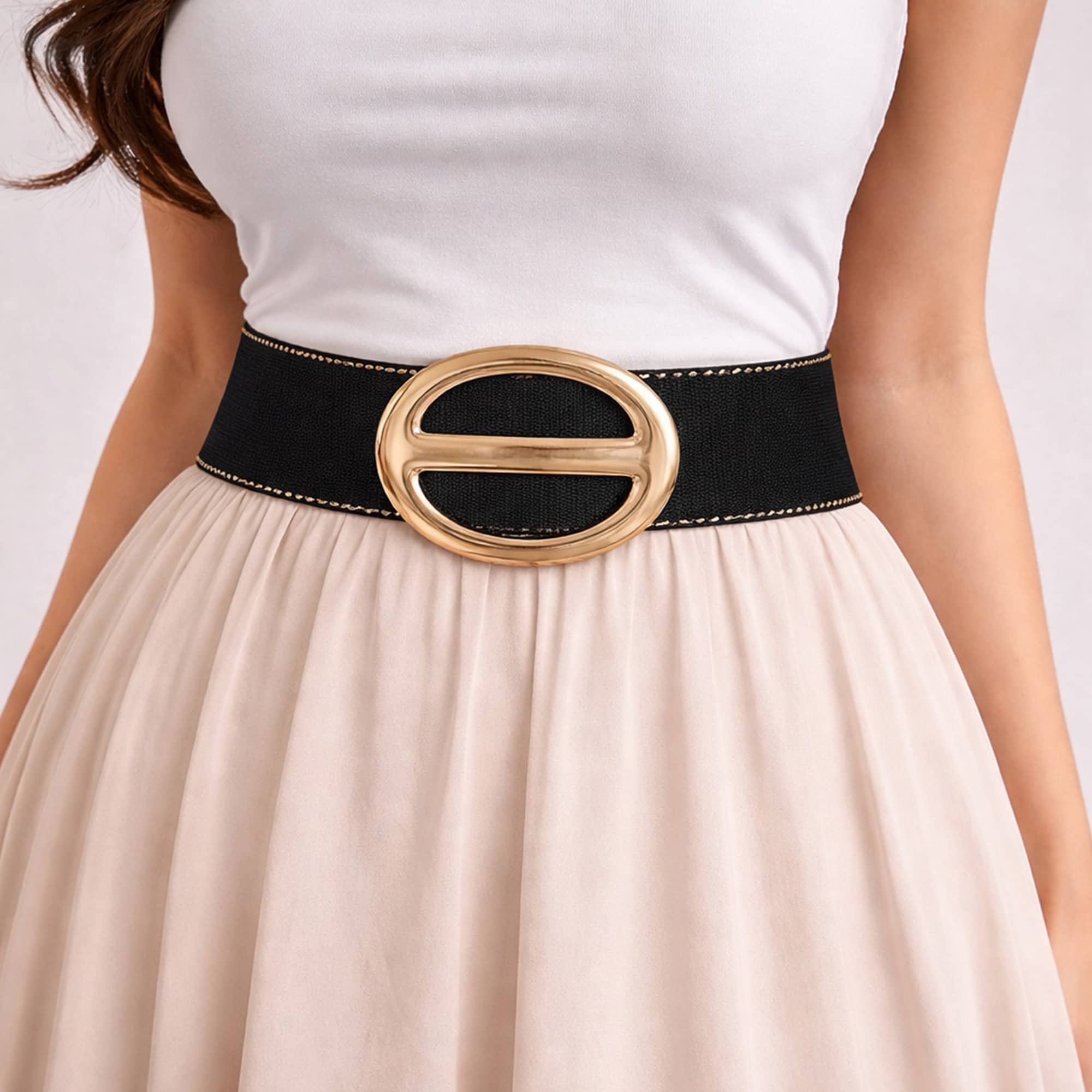 Black Elastic Waist Belt with Oval Gold Buckle for Women