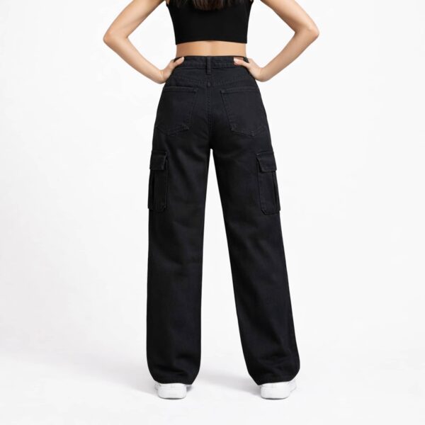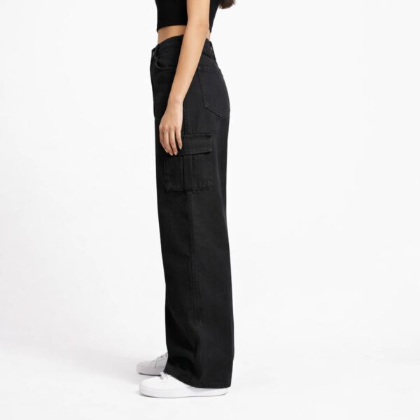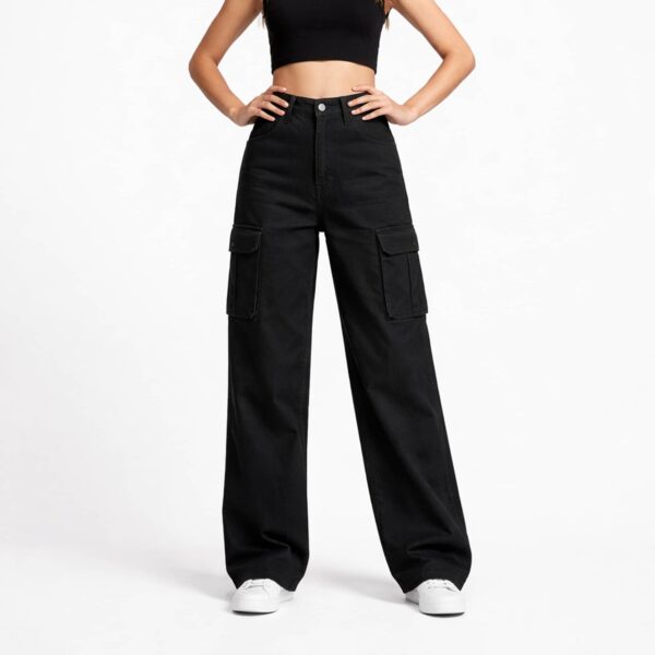Black high-waist wide-leg cargo jeans with structured tailoring and utility detailing. A versatile essential designed for bold, modern styling.