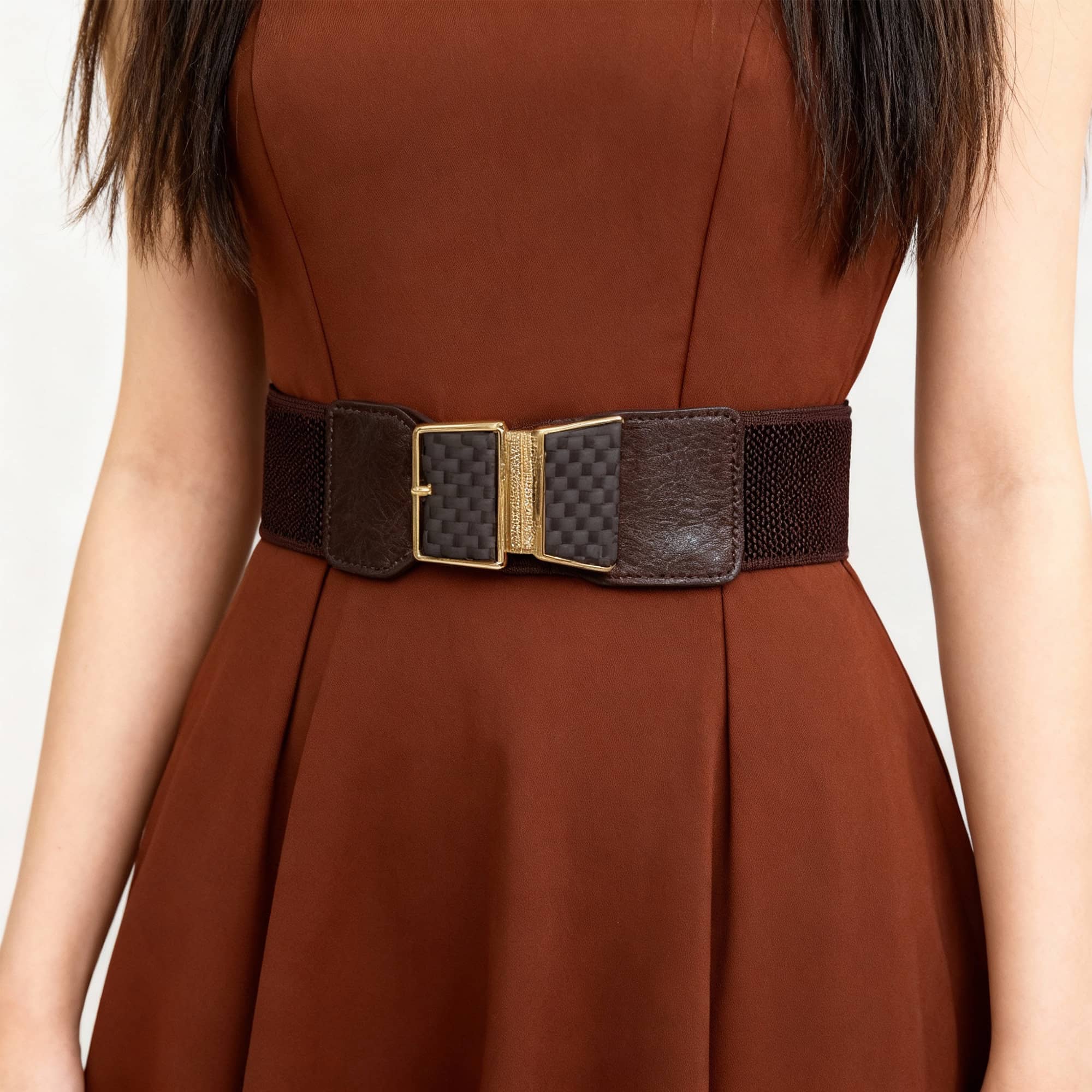 Enhance your outfit with this brown wide elastic waist belt designed to cinch your waist and add a polished finish. Featuring stretchable elastic sides and faux leather panels, this belt offers both comfort and structure.
