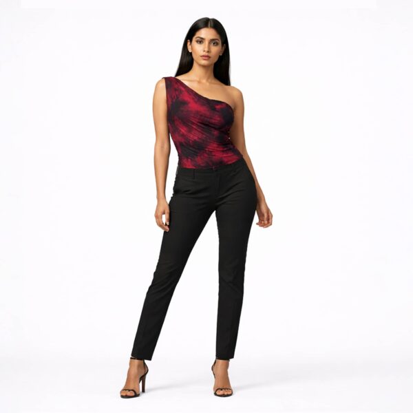 Striking and sculpted, this crimson shadow one shoulder ruched party top is designed to command attention. The asymmetric neckline creates a sharp, modern silhouette, while soft ruching across the bodice enhances natural curves and adds fluid texture. The deep red and black tie dye effect gives it a bold, dimensional finish that feels powerful yet refined. Crafted in stretch fabric for a flattering, body-contouring fit, this top pairs effortlessly with tailored trousers or sleek skirts for elevated evening styling.