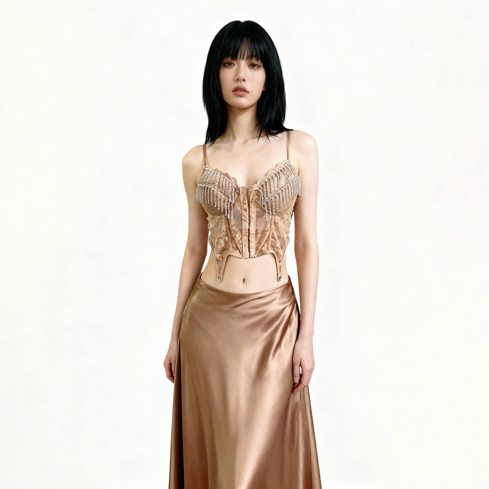 A statement bralette designed to elevate evening and occasion looks. Featuring a structured corset-inspired silhouette, this piece is detailed with delicate embellishments along the neckline that add a subtle shimmer. The slim straps and sculpted fit create a flattering shape while keeping the look refined and modern.