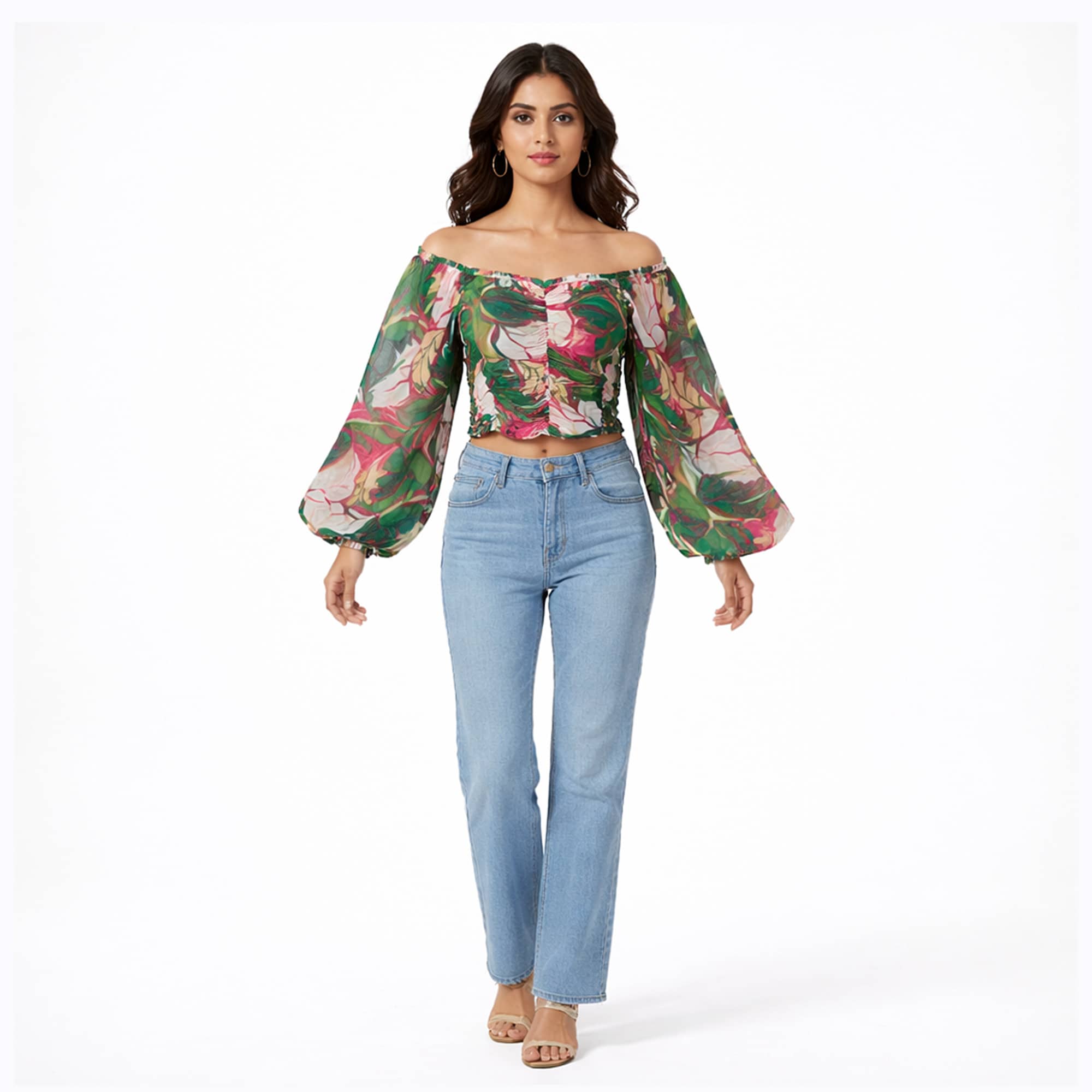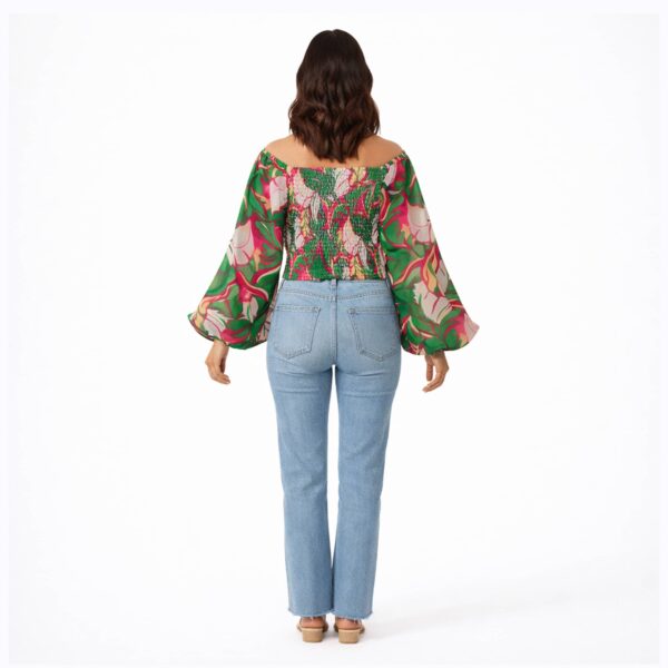 Fresh, vibrant, and effortlessly feminine, this emerald garden off shoulder crop top is designed to make an entrance. The softly gathered neckline sits elegantly off the shoulders, highlighting the collarbone while adding a romantic touch. A ruched bodice contours the waist for a flattering fit, while the voluminous sheer bell sleeves create graceful movement with every step. The bold leafy floral print blends rich greens with warm pink accents, giving the piece a lively yet refined finish.