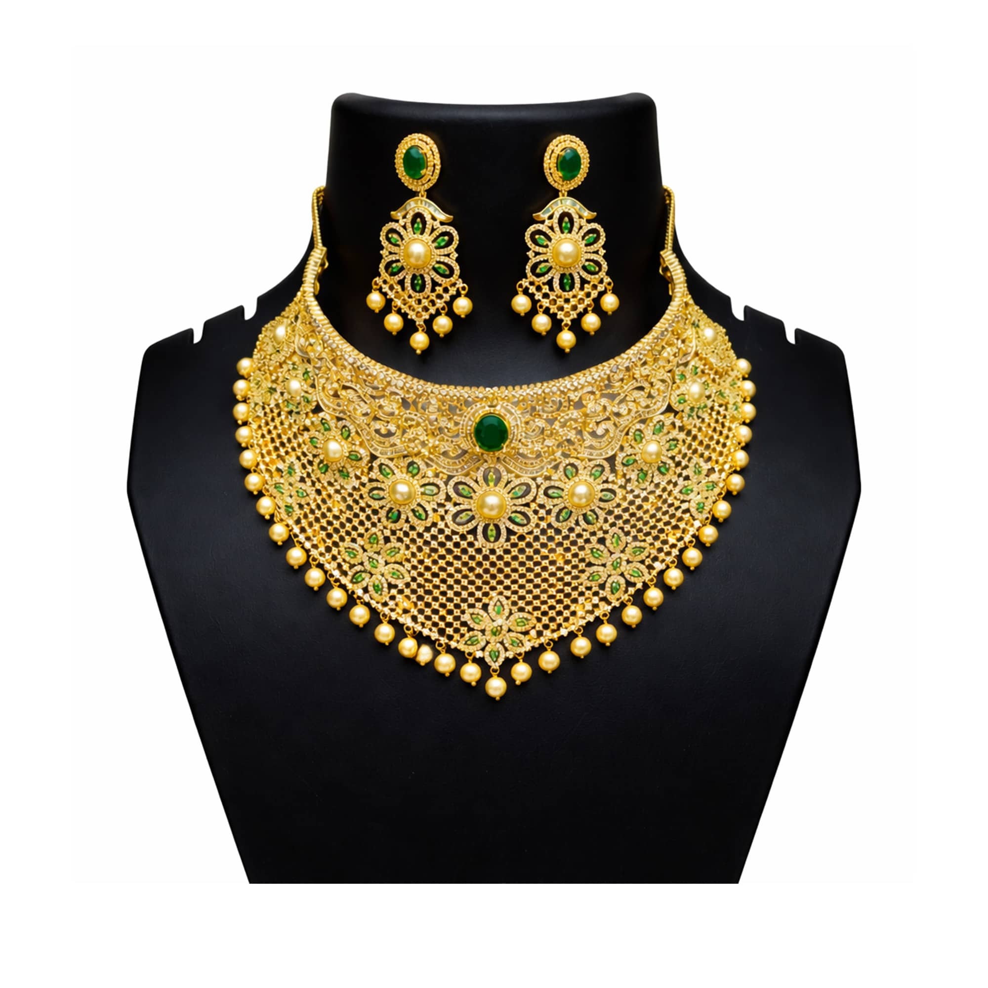 Make a regal statement with the Emerald Pearl Gold-Tone Bridal Choker Necklace Set, designed with intricate filigree detailing, rich gold-tone finish, and elegant green stone accents. The broad choker-style necklace is beautifully adorned with floral motifs and pearl drop detailing, creating a luxurious traditional look. Paired with matching statement earrings, this set is perfect for weddings, festive occasions, and grand celebrations.