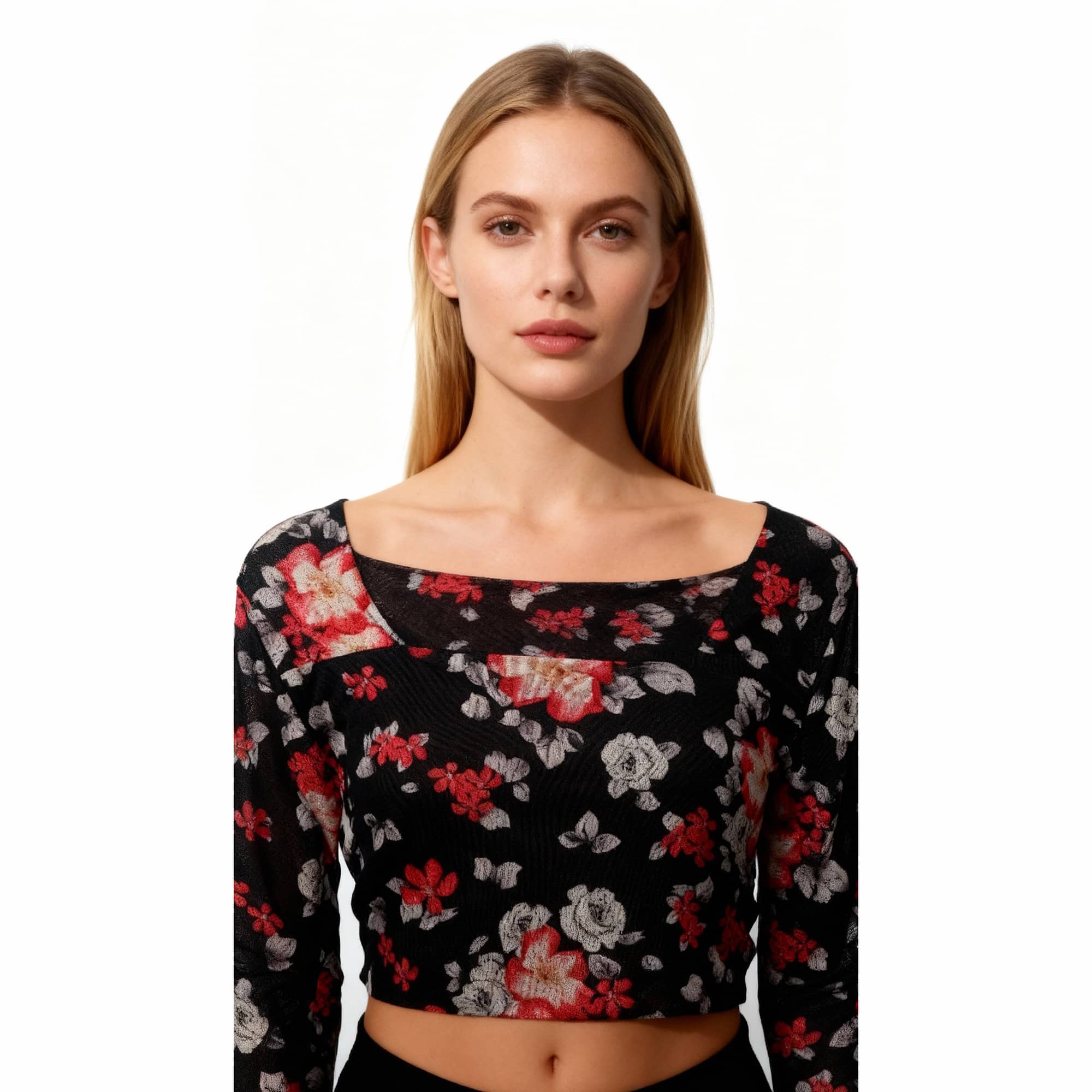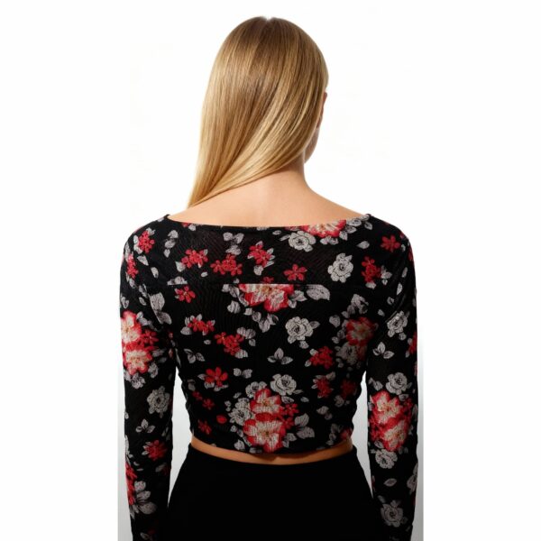 A long-sleeve floral print crop top with a clean neckline and fitted silhouette.