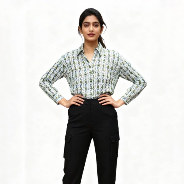 Elevate your everyday wardrobe with this green paisley print cotton shirt designed for comfort and effortless elegance. Crafted in breathable cotton, it features a classic collared neckline, button down front, and full length sleeves. The versatile print pairs beautifully with trousers, jeans, or skirts, making it a reliable choice for office wear, casual outings, or smart daytime looks.