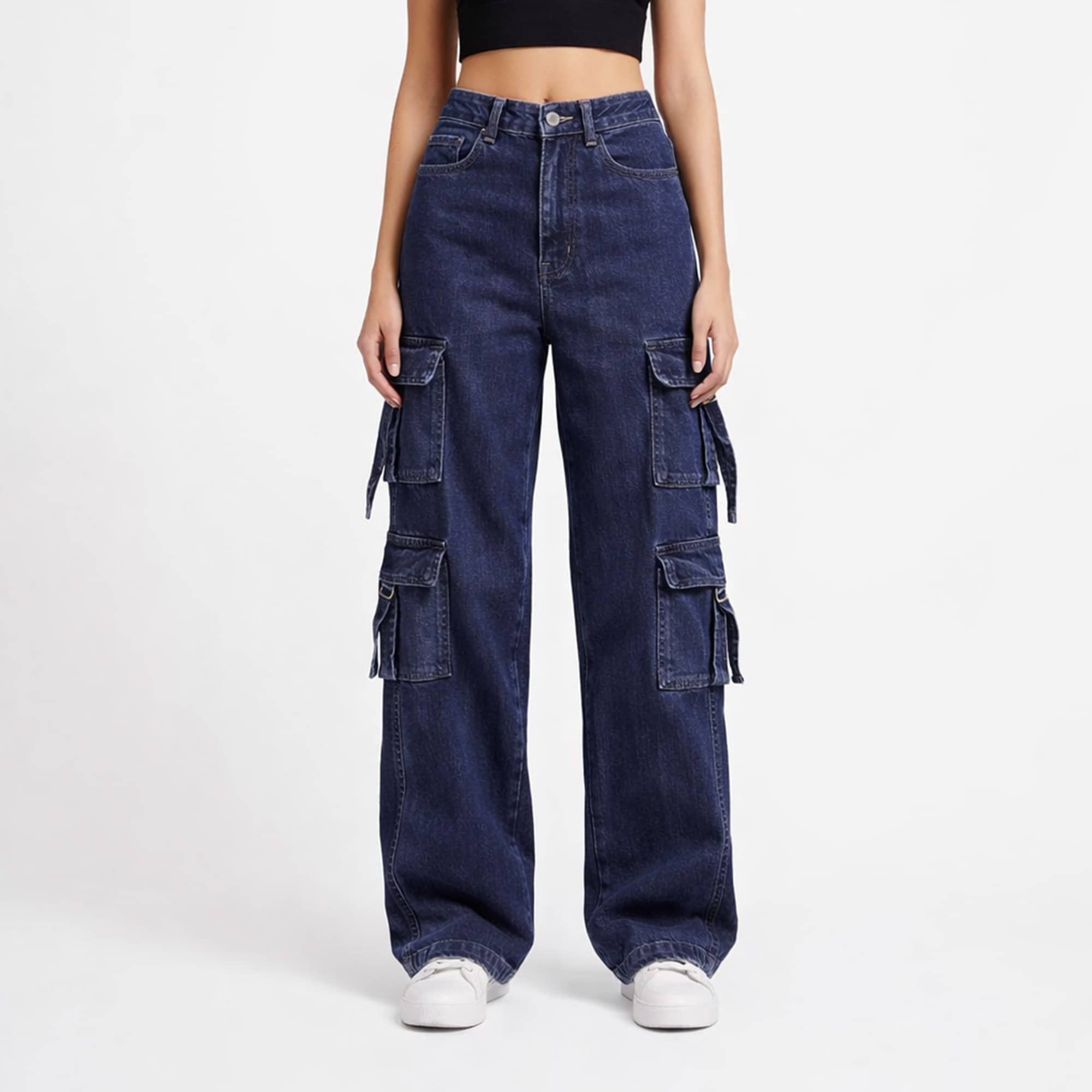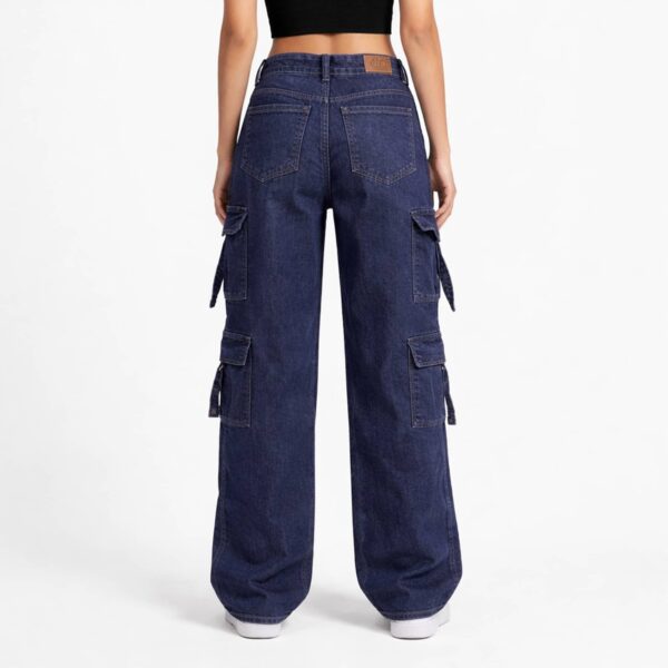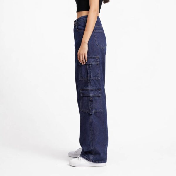 Upgrade your everyday denim with these statement-making high waist cargo pants. Designed in a rich dark blue wash, this wide-leg silhouette blends classic structure with modern utility details. The high-rise waistband defines and flatters, while the relaxed wide-leg cut creates a lengthened, effortless look. Multiple functional cargo pockets add a bold street-style edge without compromising comfort.