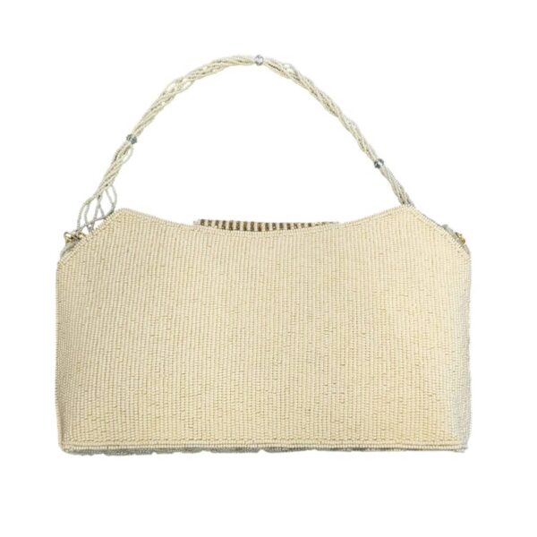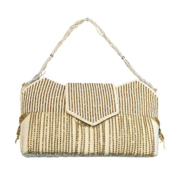 An elegant ivory shoulder clutch featuring intricate gold bead detailing. Perfect for weddings festive events and evening parties.Comes with a beaded handle for comfortable carry and statement style.