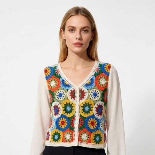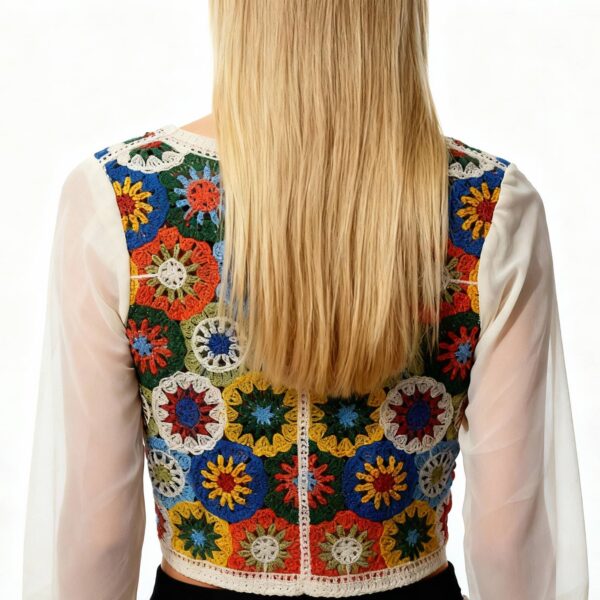 A bold, handcrafted crochet vest featuring intricate circular motifs in vibrant multicolour patterns. Designed with a flattering V-neckline and front button closure, this piece blends traditional crochet artistry with a modern, wearable silhouette.