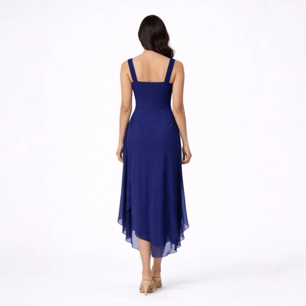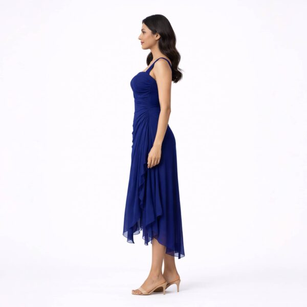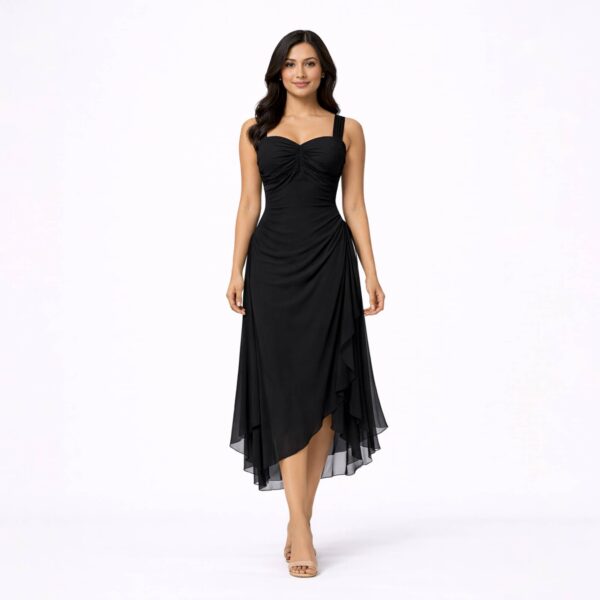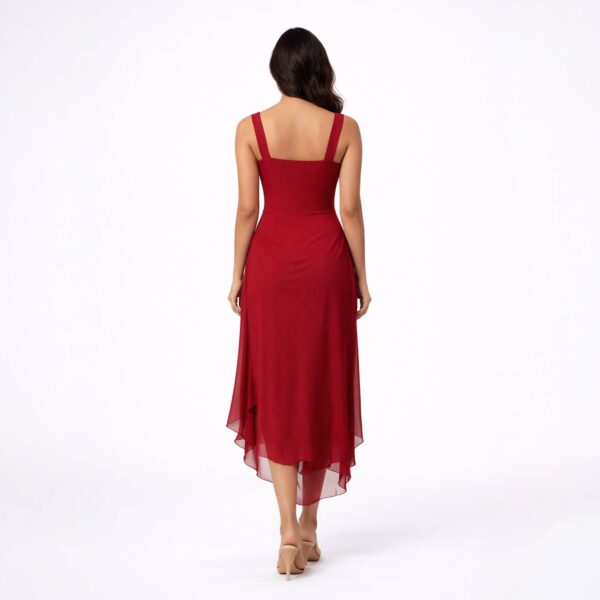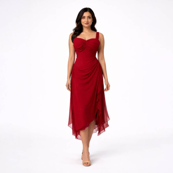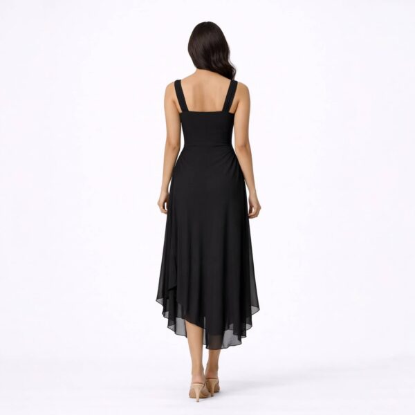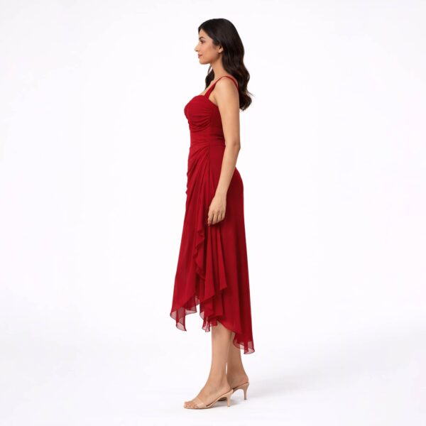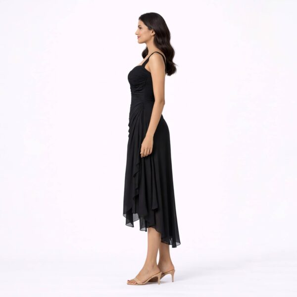 The layered asymmetrical hem introduces movement and fluid elegance, giving the dress a refined yet striking presence. Falling to a midi length, it balances sophistication with modern edge, making it ideal for elevated evenings and statement occasions.