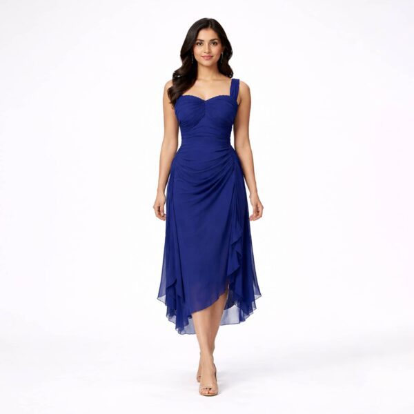 Designed to define and flatter, this sculpted hourglass asymmetrical midi dress enhances natural curves with strategic draping and soft structure. The gathered bust detail creates a feminine focal point, while wide supportive straps frame the neckline beautifully. Gentle ruching through the waist smooths and contours, creating a confident, body-enhancing silhouette.