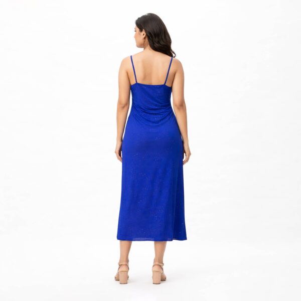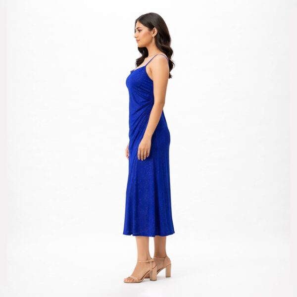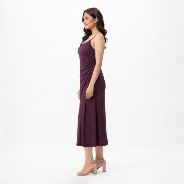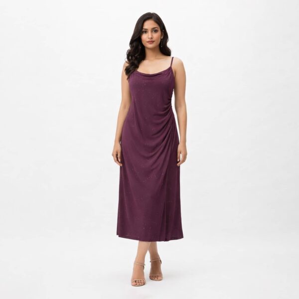 Shimmer ruched strap midi dress with a softly draped neckline and elegant silhouette, perfect for evening occasions and refined party styling.