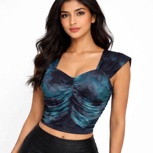Teal abstract ruched crop top with a flattering sweetheart neckline. A statement piece designed for bold, confident styling.
