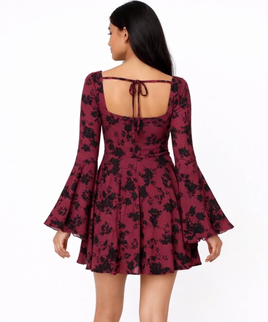 Wine Floral Square Neck Flared Sleeve Mini Dress